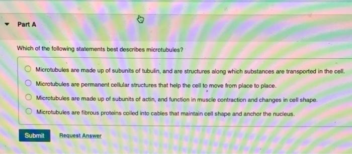 Microtubules are permanent cellular structures that help the cell to move from place to place. Part A Which of the following statements best describes microtubules. A set of ribosomes that is held together by microtubules.